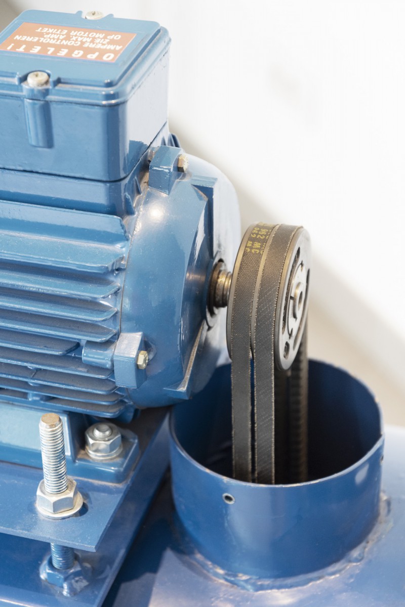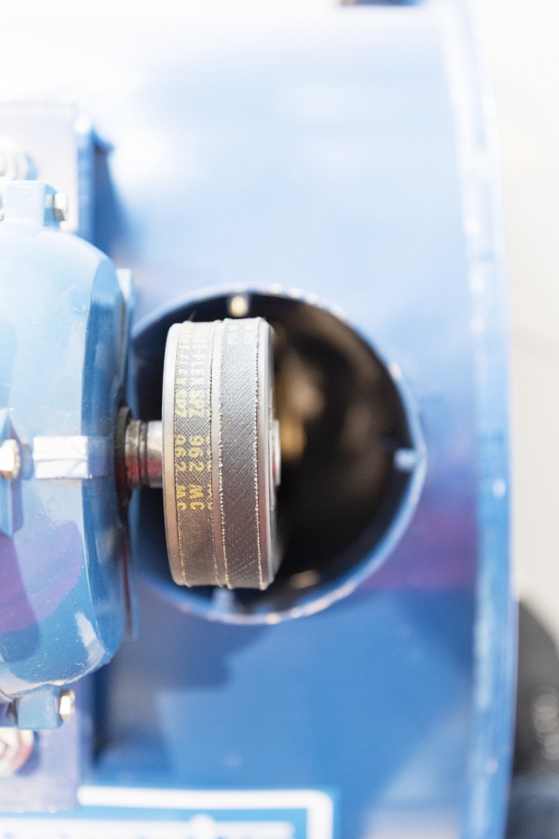 Er is een inspectieluik op het ventilatorhuis, motor op stoel met regelbare riemspanning, riemschijven en riemen in protectiekast.