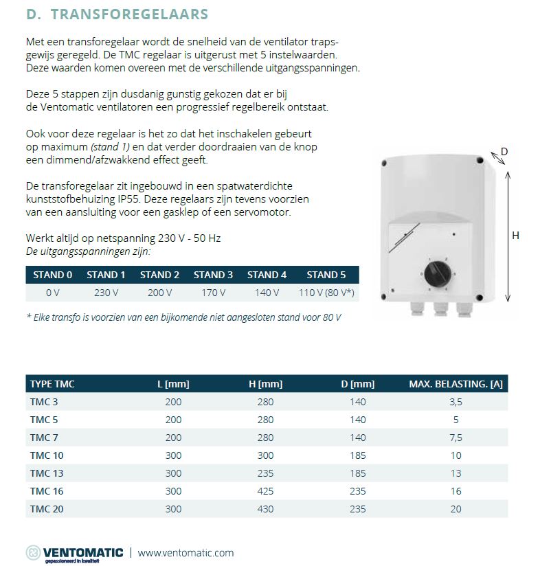De TMC regelaar is uitgerust met 5 instelwaarden. Deze waarden komen overeen met de verschillende uitgangsspanningen. Deze 5 stappen zijn dusdanig gunstig gekozen dat er bij de Ventomatic ventilatoren een progressief regelbereik ontstaat.